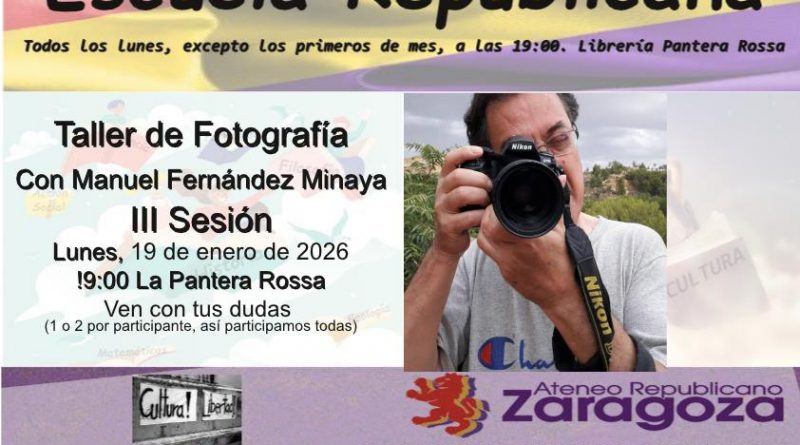 El próximo lunes, día 19 de enero de 2026, a las 19 h, seguimos en la Escuela Republicana con el Taller de Fotografía que imparte el conocido profesional Manuel Fernández Minaya. Tiene lugar en lunes alternos, intercalados con otros temas de la Escuela.